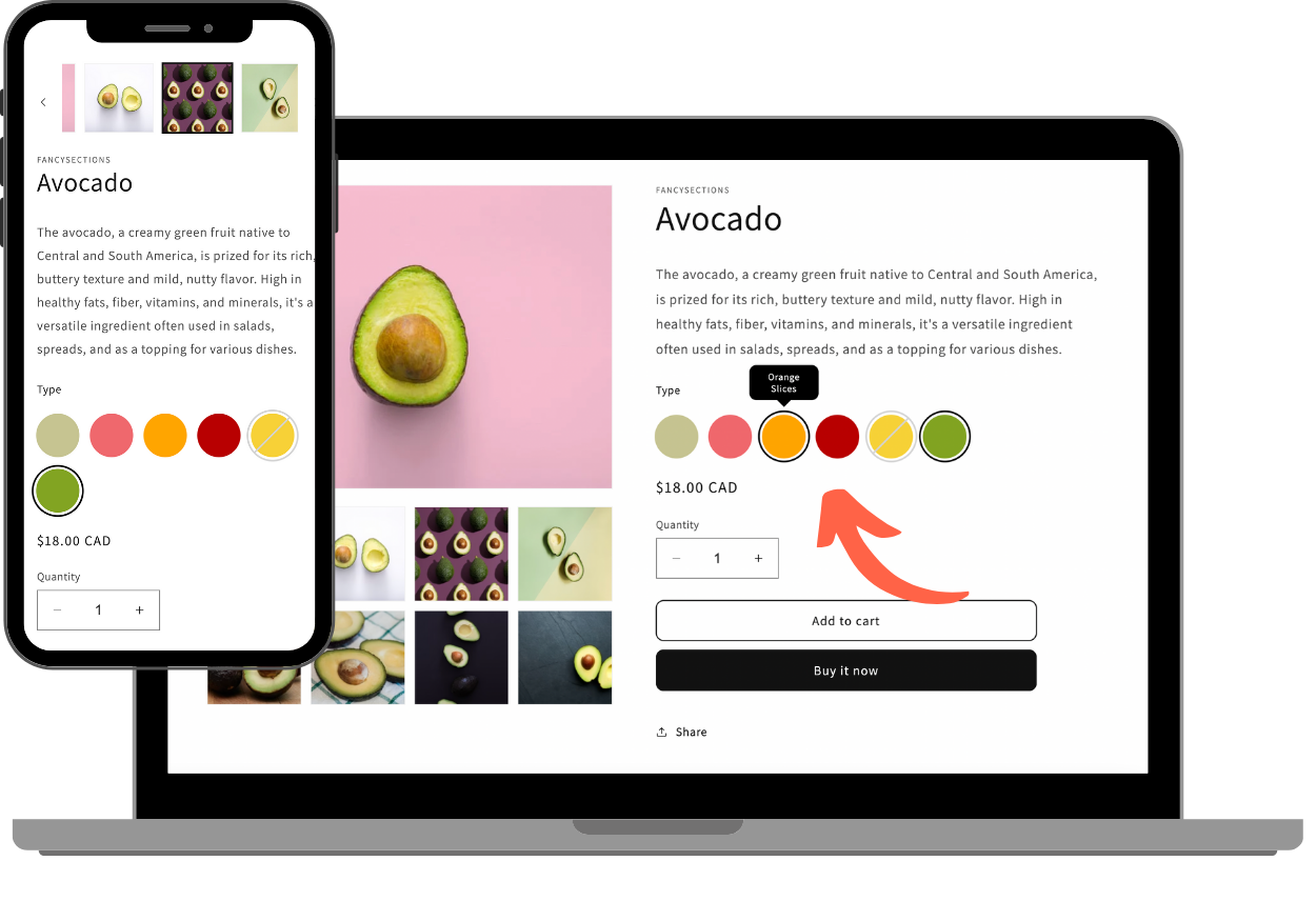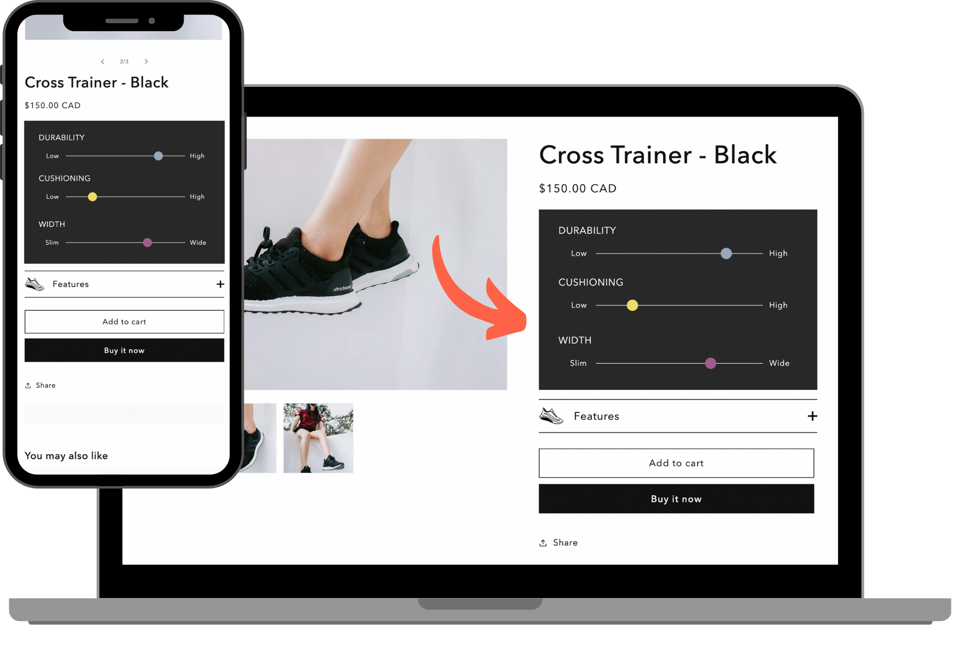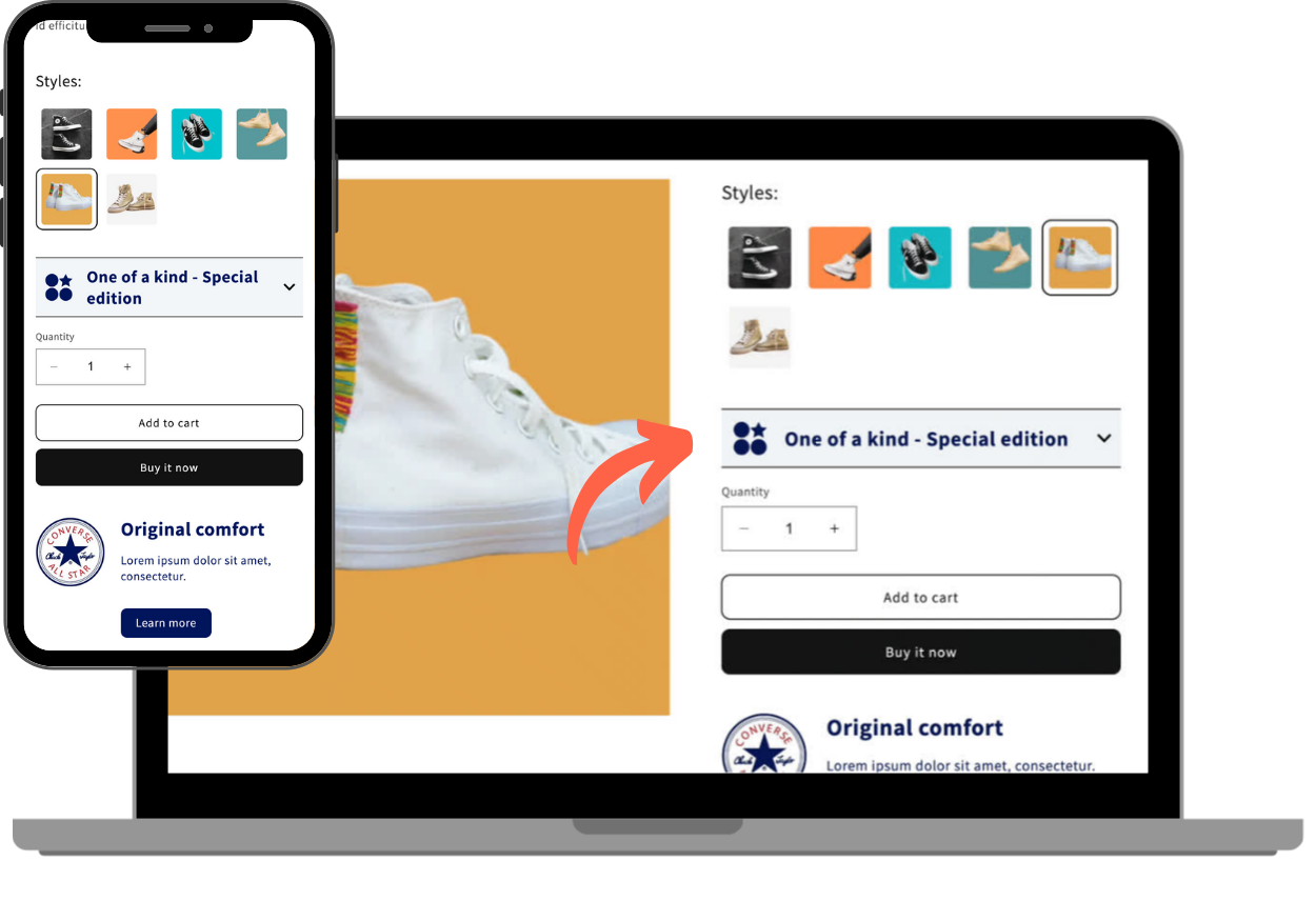Connected Products links separate product pages for easy navigation. Each product page can be displayed as a "fake variant." This approach allows you to showcase individual product features while keeping the overall browsing process uncomplicated and doesn't require you to set up variants within the product admin.