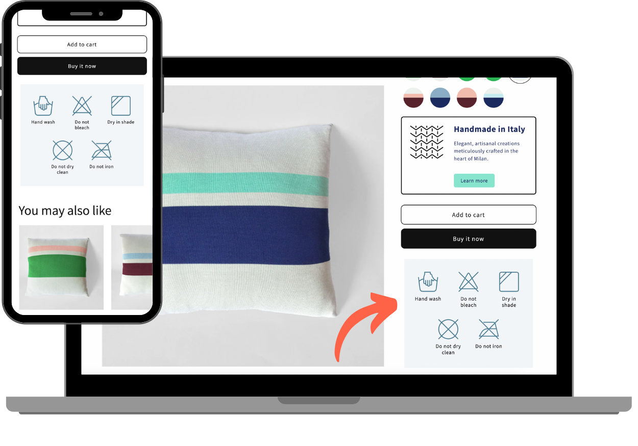 Add up to 5 different icons or photos to quickly show off the product features such as: Unique value propositions, Ingredients, Washing instructions, and other product highlights.