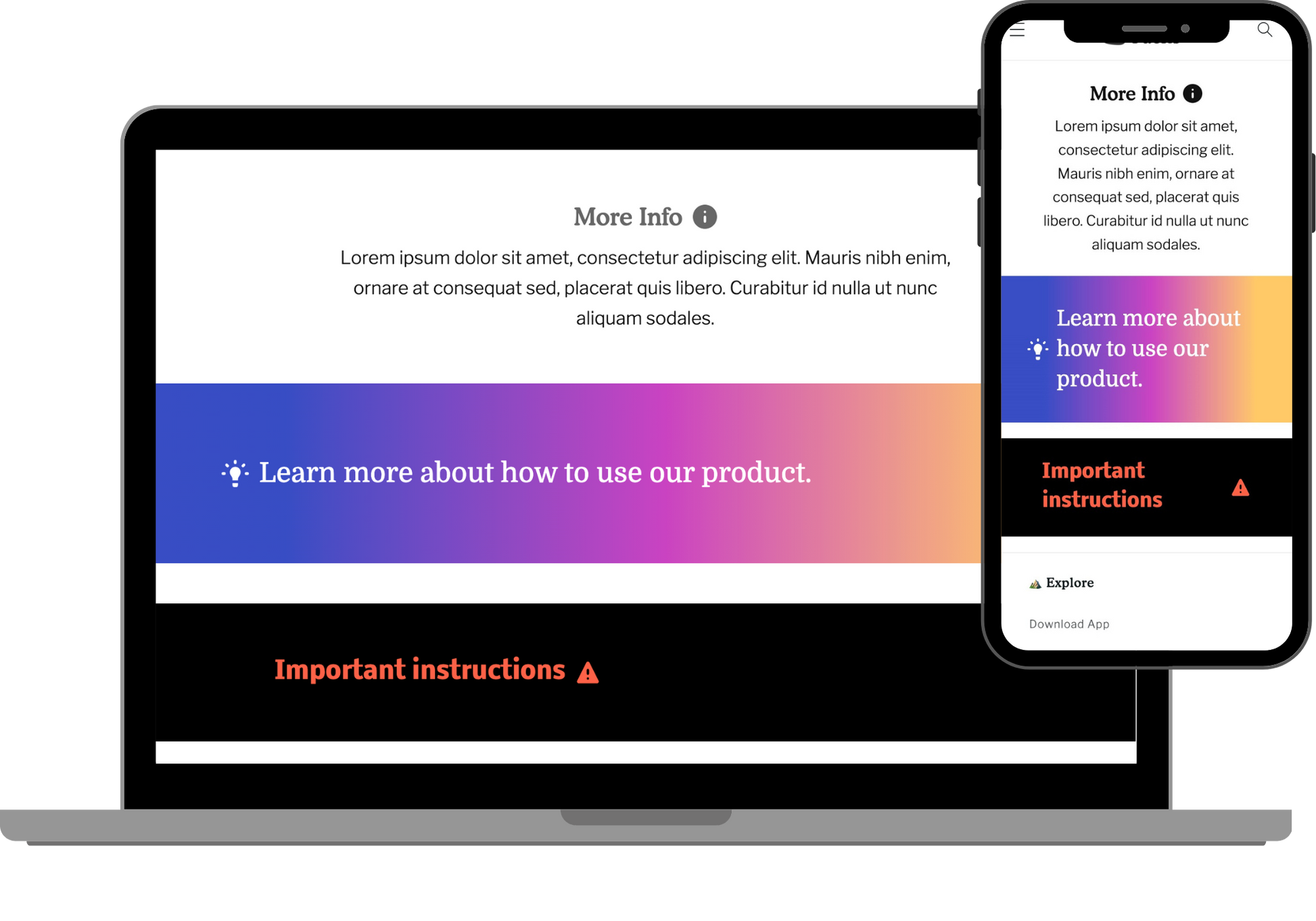 A handy little section that is deceptively simple. Need to add some extra info but it's a LOT of text to show all at once? Add a little banner callout with this text that expands on click. Perfect for extra product details.